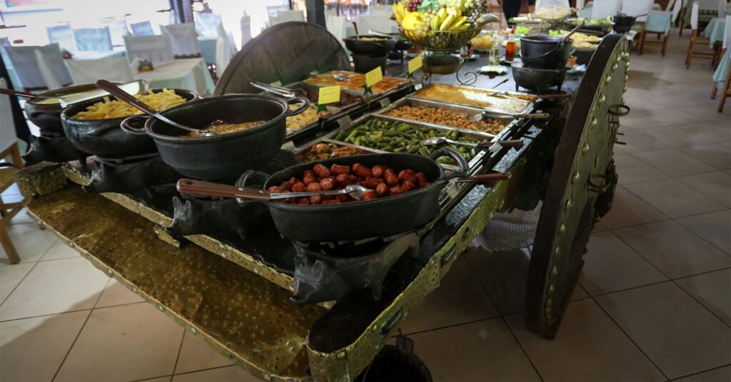 Localizado junto a sede do Hotel Fazenda Caluje, o restaurante convida você a desfrutar de um rico buffet que conta com frios, saladas, massas, acompanhamentos e carnes preparados no tradicional fogão campeiro, junto de uma vista espetacular.