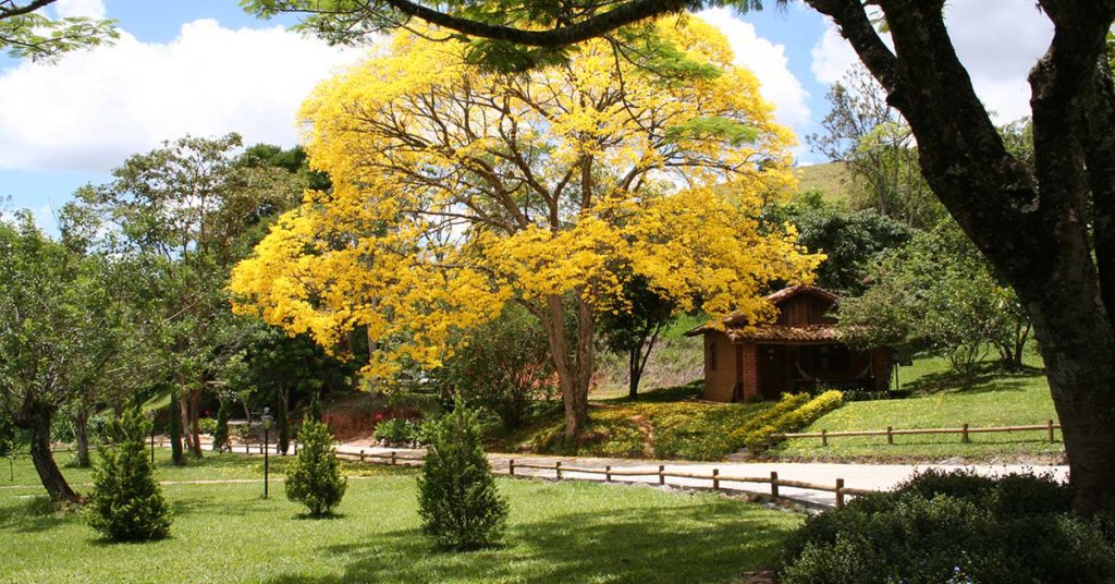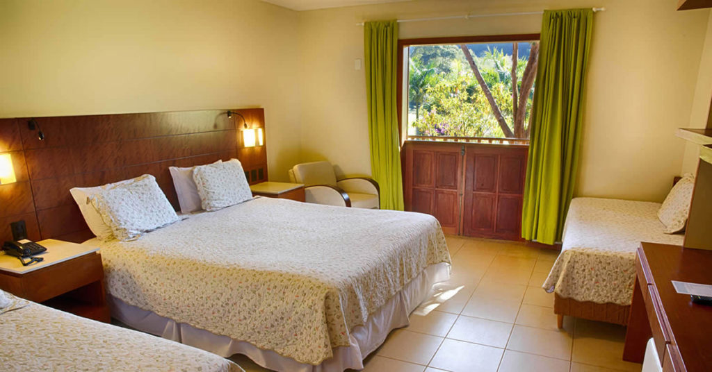 >Ipê – 40 unidades – Ambiente único no 1º ou 2º andar para até 04 pessoas: quarto com cama de casal, 02 camas de solteiro, ar-condicionado, cofre, frigobar, telefone, tv a cabo, banheiro com secador de cabelo e varanda. Aproximadamente a 100 metros do corpo do hotel.